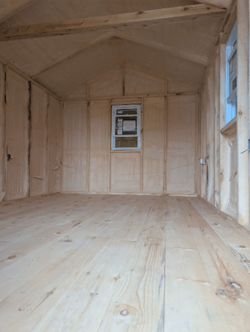 Closed Cell Polyurethane Spray Foam on a barn/shed ceiling. 1 Inch of foam has an R-Value of 6.
