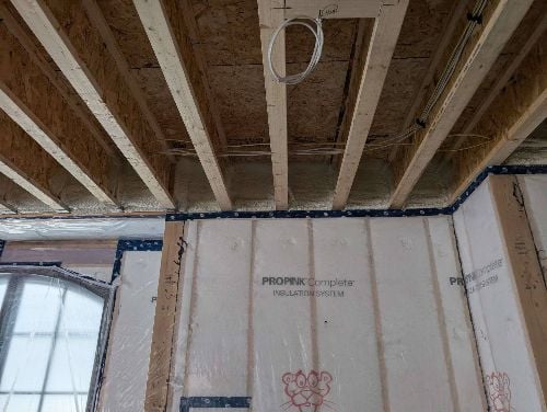 The photo above shows how different types of insulation can be used together. Polyurethane foam has been applied to the headers then we have the Blown in Blanket System in the wall cavities for a great combination of air sealing and warmth.